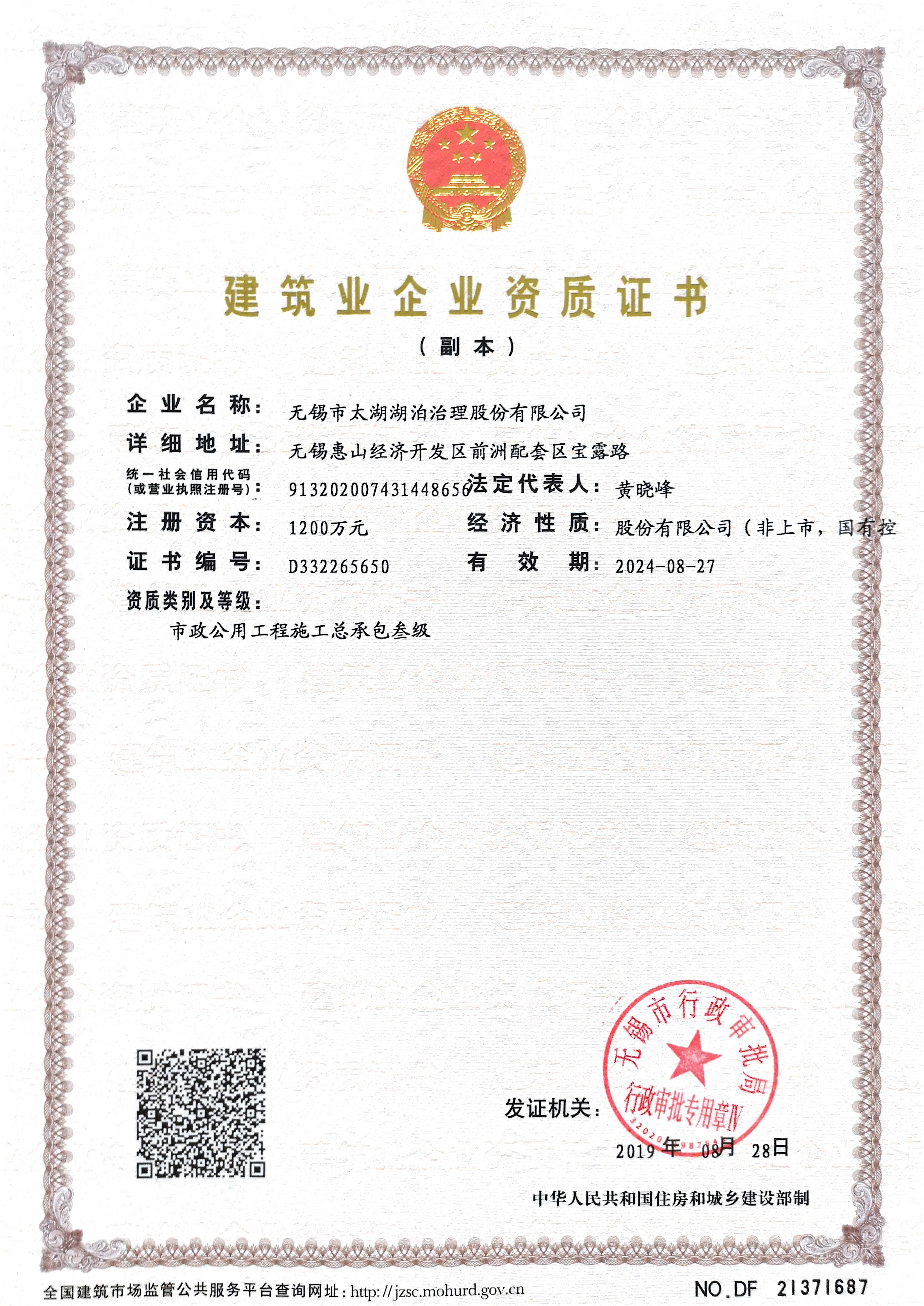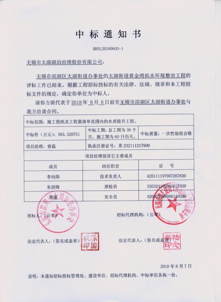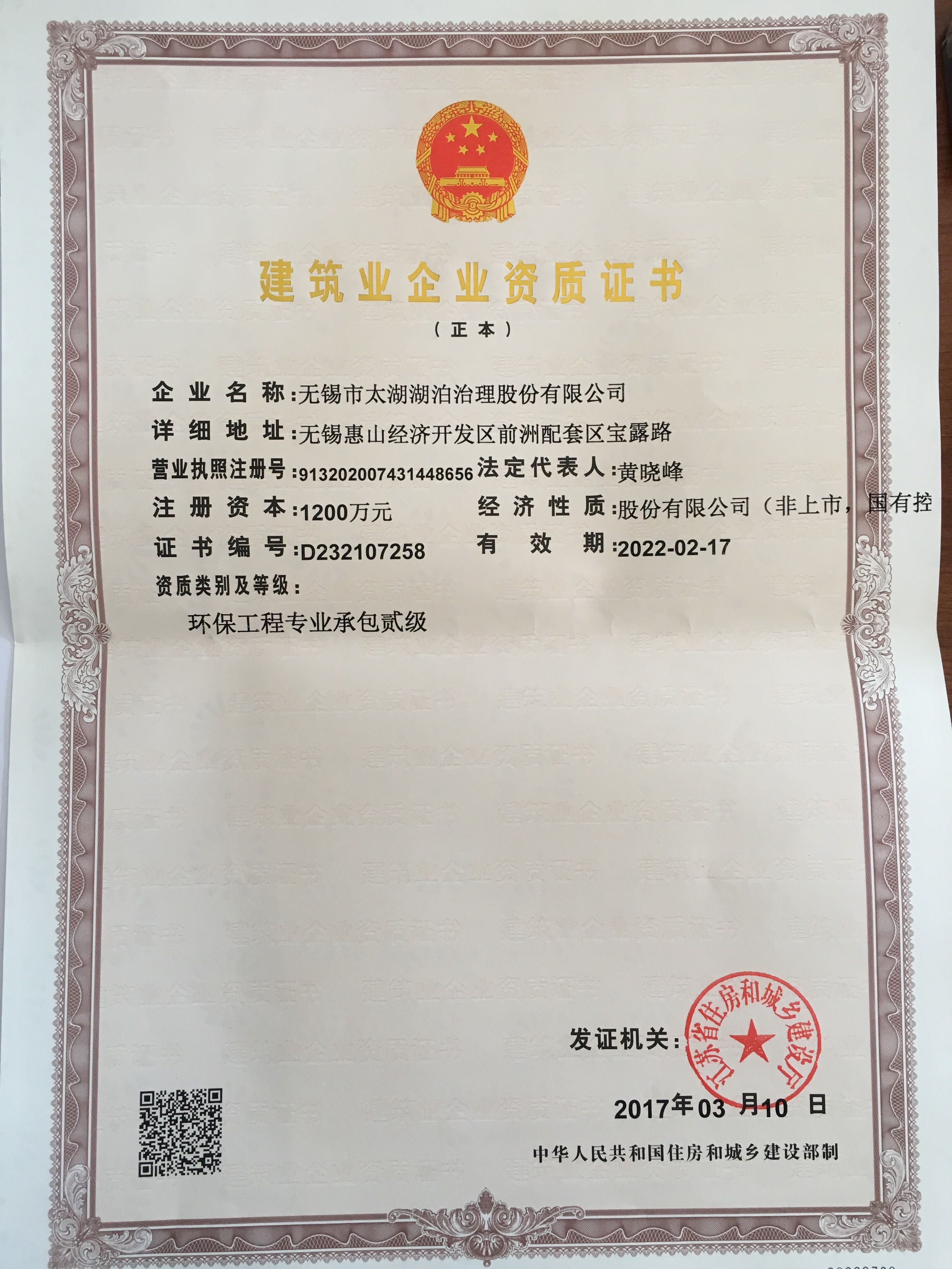 湖泊公司榮升環(huán)保工程專(zhuān)業(yè)承包貳級(jí)資質(zhì)